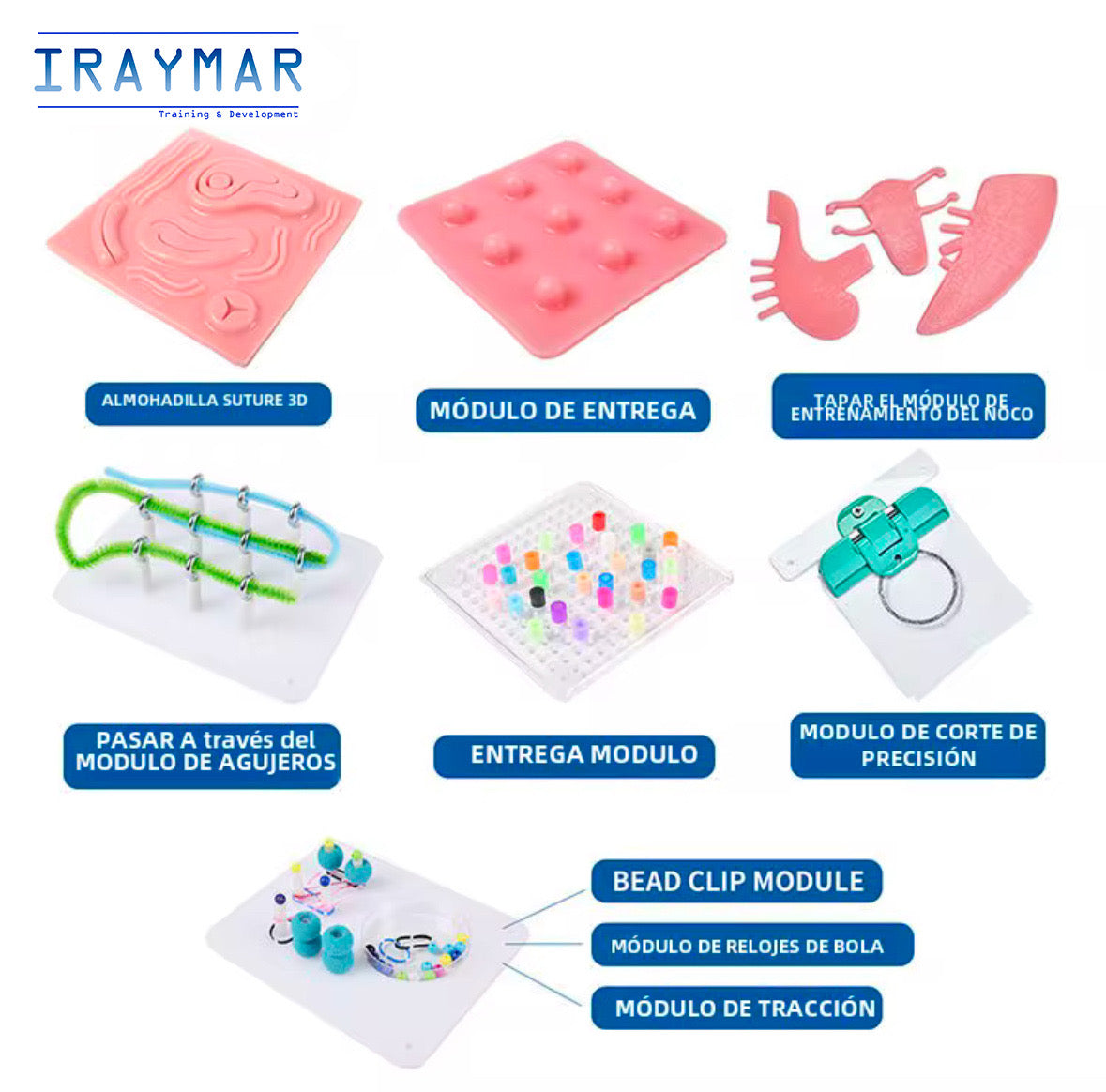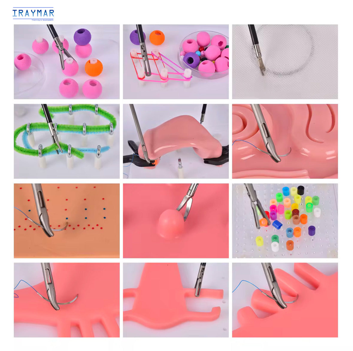Este kit de entrenamiento laparoscópico abarca una variedad de técnicas fundamentales, incluyendo: